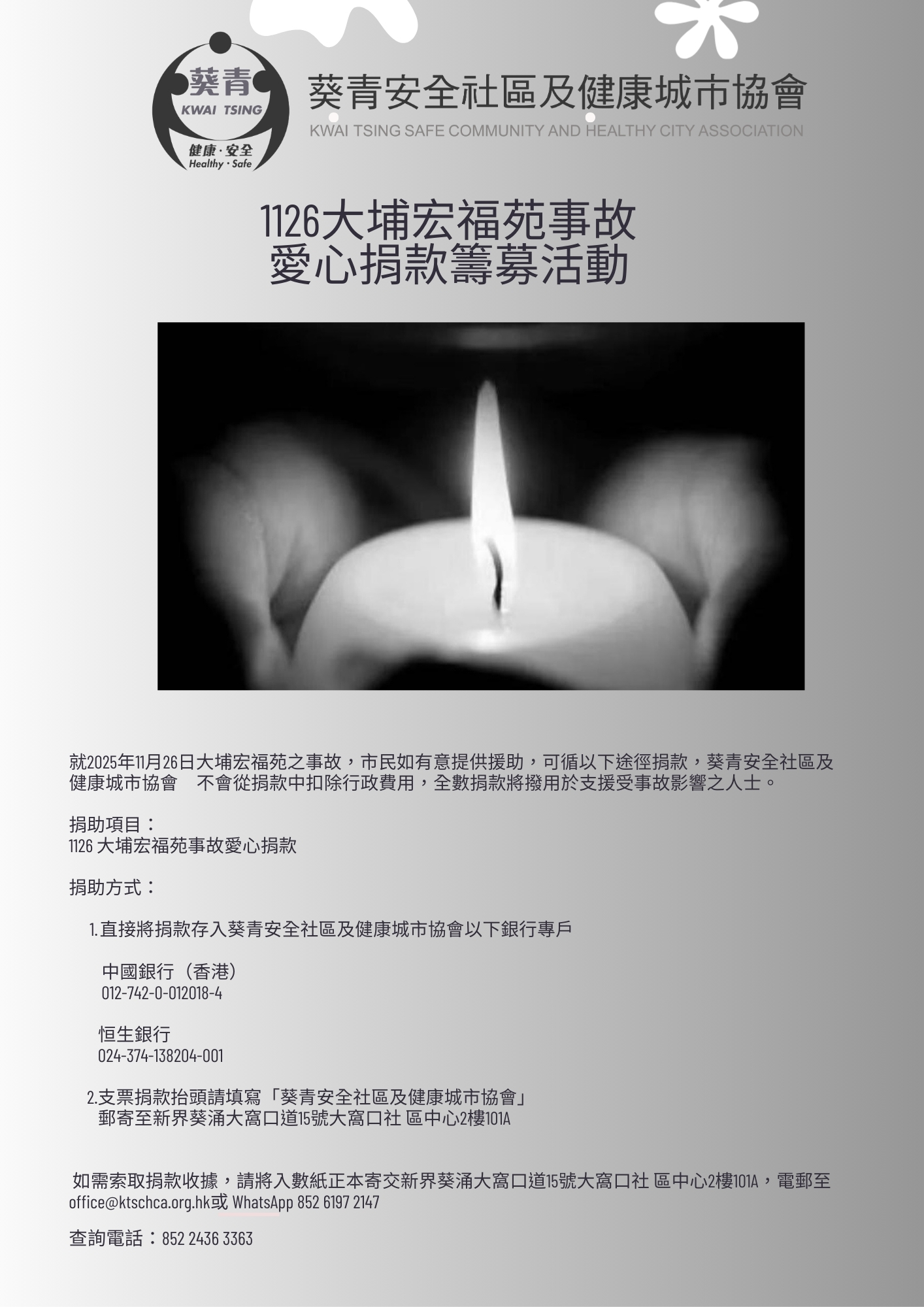 葵青安全社區及健康城市協會 秉持協會成立的宗旨,世界衛生組織「安全社區」及「健康城市」的理念,為建造一個更安全、健康、活力、和諧的葵青社區繼續努力。 了解更多 1126⼤埔宏福苑事故愛⼼捐款籌募活動 社區參與計劃免費中醫服務 社區牙科支援計劃 賽馬會社區牙科服務計劃 葵青社區重點項目 (第五期) 1126⼤埔宏福苑事故愛⼼捐款籌募活動 社區參與計劃免費中醫服務 社區牙科支援計劃 賽馬會社區牙科服務計劃 葵青社區重點項目 (第五期) 最新消息1126⼤埔宏福苑事故愛⼼捐款籌募活動2025年12月7日立法會換屆選舉2025-2026 社區參與計劃_社區健康日2025-2026 社區參與計劃_免費中醫服務2025-2026 社區參與計劃_流感針疫苗接種計劃葵青安全社區及健康城市協會9月約滿營運葵青地區康健中心2025年9月13日新界區賣旗日10th Asian Preventive Cardiology & Cardiac Rehabilitation Conference 22-242024年6月8日新界區賣旗日2023分區社區健康日2023年流感疫苗注射服務海報葵青安全社區及健康城市協會二十周年紀念特刊新冠康復者中醫診療服務葵青社區重點項目(第五期)影片415 新界區賣旗日社區重點項目第五期-學童近視控制眼鏡驗配服務(服務者使用聲明)社區重點項目第五期-學童近視控制眼鏡驗配服務海報社區重點項目第五期-新冠康復者中醫診療服務海報社區重點項目第五期-流感疫苗注射服務2022-2023 海報社區重點項目第五期-流感疫苗注射服務2022-2023 登記表格社區重點項目第五期-學童近視控制眼鏡驗配服務2022-20231030 新界區賣旗日與中建國際醫療產業發展有限公司簽定戰略合作協議展翅青見計劃新冠疫苗知多D「2020社會資本動力獎」Social Capital Builder (SCB) Awards 2020 個人衛生小知識 怎樣佩戴口罩?(資料來源: 衛生防護中心) 正確洗手五部曲 (資料來源: 衛生防護中心) 「預防新型冠狀病毒感染」路線圖 (資料來源: 衛生防護中心) 活動資訊大窩口社區健康中心 (活動資訊) 葵青社區重點項目有關葵青社區重點項目的詳情可瀏覽 http://www.kwaitsingsps.org.hk 協會網站瀏覽人次請按此