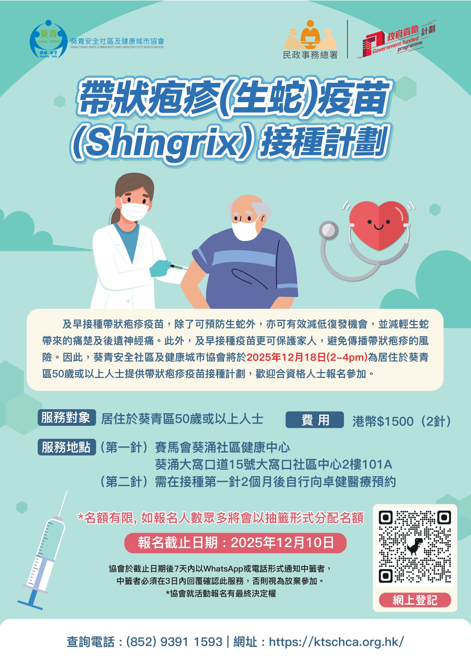 葵青安全社區及健康城市協會 秉持協會成立的宗旨,世界衛生組織「安全社區」及「健康城市」的理念,為建造一個更安全、健康、活力、和諧的葵青社區繼續努力。 了解更多 1126⼤埔宏福苑事故愛⼼捐款籌募活動 帶狀疱疹疫苗接種計劃 社區參與計劃免費中醫服務 社區牙科支援計劃 賽馬會社區牙科服務計劃 葵青社區重點項目 (第五期) 1126⼤埔宏福苑事故愛⼼捐款籌募活動 帶狀疱疹疫苗接種計劃 社區參與計劃免費中醫服務 社區牙科支援計劃 賽馬會社區牙科服務計劃 葵青社區重點項目 (第五期) 最新消息 帶狀疱疹(生蛇)疫苗接種計劃 1126⼤埔宏福苑事故愛⼼捐款籌募活動 2025年12月7日立法會換屆選舉 2025-2026 社區參與計劃_社區健康日 2025-2026 社區參與計劃_免費中醫服務 2025-2026 社區參與計劃_流感針疫苗接種計劃 葵青安全社區及健康城市協會9月約滿營運葵青地區康健中心 2025年9月13日新界區賣旗日 10th Asian Preventive Cardiology & Cardiac Rehabilitation Conference 22-24 2024年6月8日新界區賣旗日 2023分區社區健康日 2023年流感疫苗注射服務海報 葵青安全社區及健康城市協會二十周年紀念特刊 新冠康復者中醫診療服務 葵青社區重點項目(第五期)影片 415 新界區賣旗日 社區重點項目第五期-學童近視控制眼鏡驗配服務(服務者使用聲明) 社區重點項目第五期-學童近視控制眼鏡驗配服務海報 社區重點項目第五期-新冠康復者中醫診療服務海報 社區重點項目第五期-流感疫苗注射服務2022-2023 海報 社區重點項目第五期-流感疫苗注射服務2022-2023 登記表格 社區重點項目第五期-學童近視控制眼鏡驗配服務2022-2023 1030 新界區賣旗日 與中建國際醫療產業發展有限公司簽定戰略合作協議 展翅青見計劃 新冠疫苗知多D 「2020社會資本動力獎」 Social Capital Builder (SCB) Awards 2020 個人衛生小知識 怎樣佩戴口罩?(資料來源: 衛生防護中心) 正確洗手五部曲 (資料來源: 衛生防護中心) 「預防新型冠狀病毒感染」路線圖 (資料來源: 衛生防護中心) 活動資訊大窩口社區健康中心 (活動資訊) 葵青社區重點項目有關葵青社區重點項目的詳情可瀏覽 http://www.kwaitsingsps.org.hk 協會網站瀏覽人次請按此