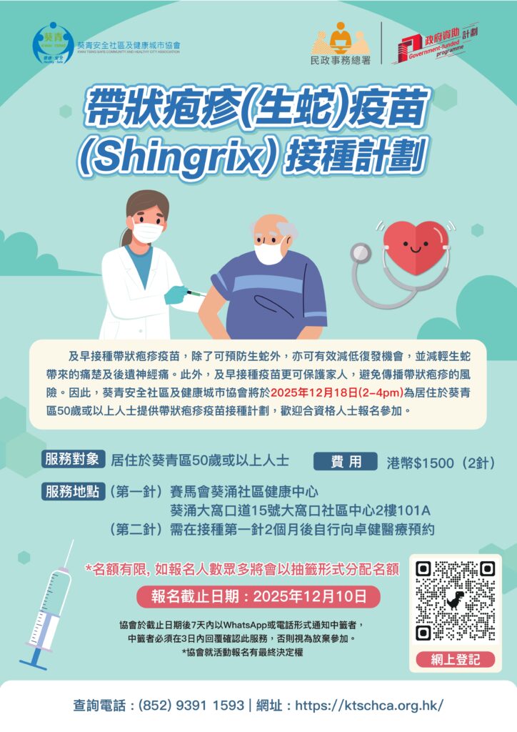 今年葵青安全社區及健康城市協會得到民政事務總署資助,將於【2025年12月18日(四)下午 2 點 至 4 點】為居住於葵青區、50歲或以上人士提供帶狀疱疹(生蛇)疫苗接種服務,名額有限,歡迎合資格街坊把握機會報名參加 🙌。