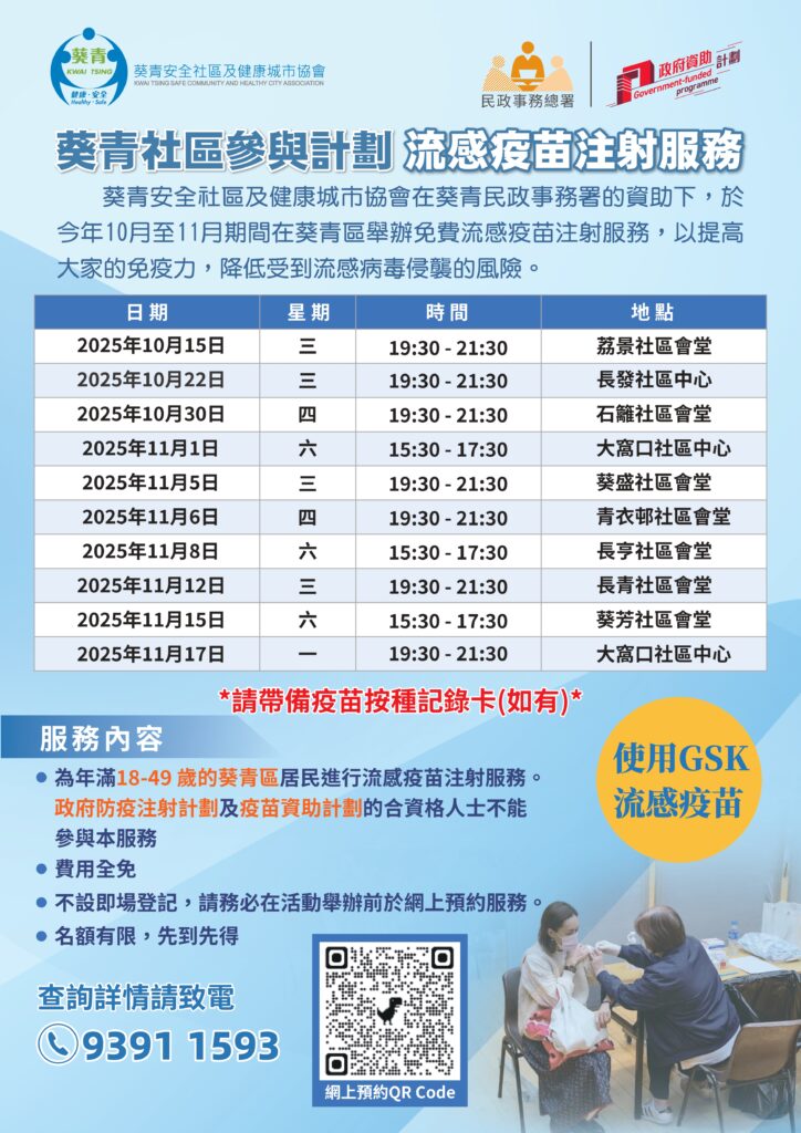 葵青安健協會獲民政事務總署資助, 於2025年11月至12月期間, 為葵青區內年滿18歲至49歲的葵青區居民免費接種流感疫苗。